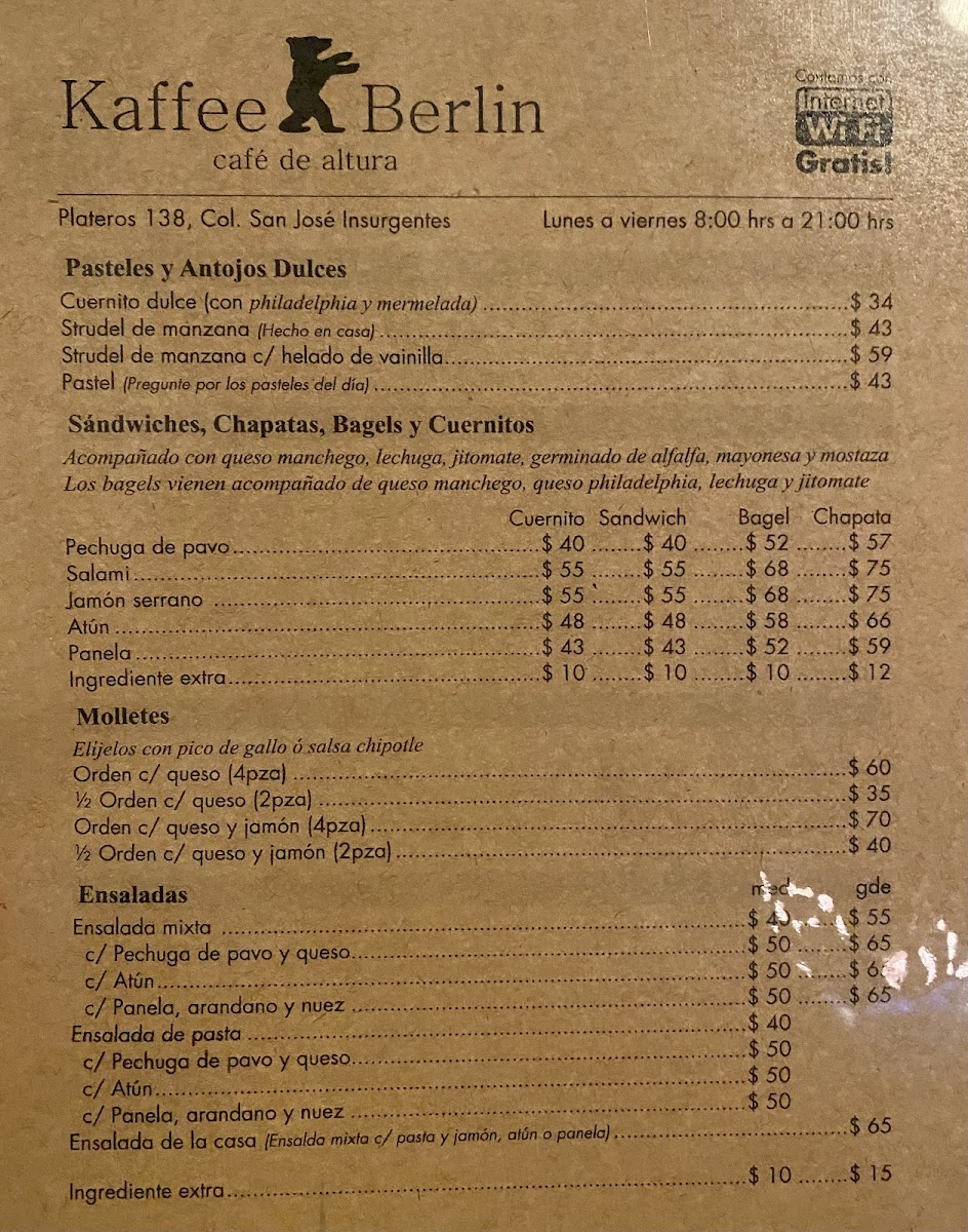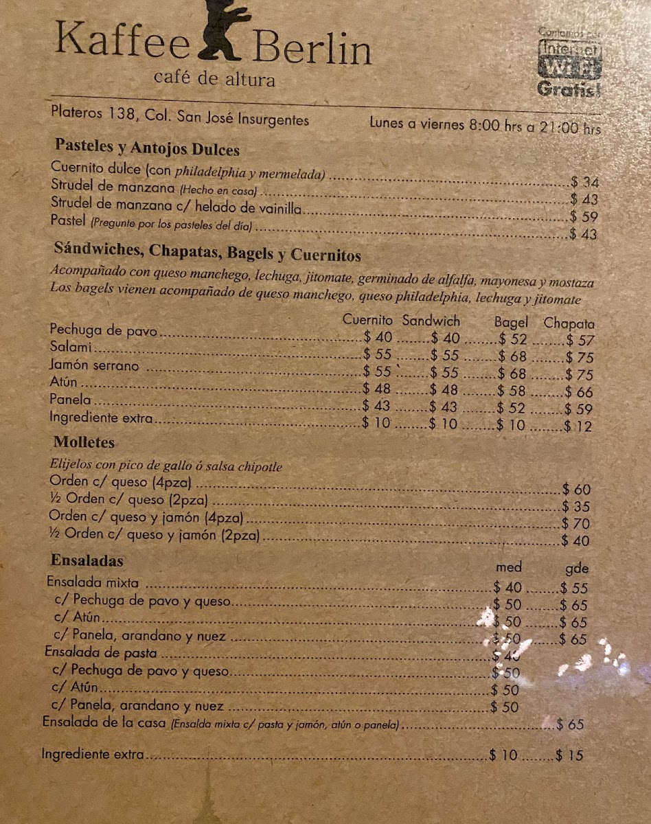 Welcome to Kaffee Berlin, a charming café located in the heart of San José Insurgentes, Ciudad de México. Known for its inviting atmosphere, this establishment is perfect for both work and leisure. The menu boasts a selection of simple yet flavorful dishes, ideal for casual dining. Highlights include their delicious lasagna, highly praised by many patrons, and irresistible sweets like brownies.